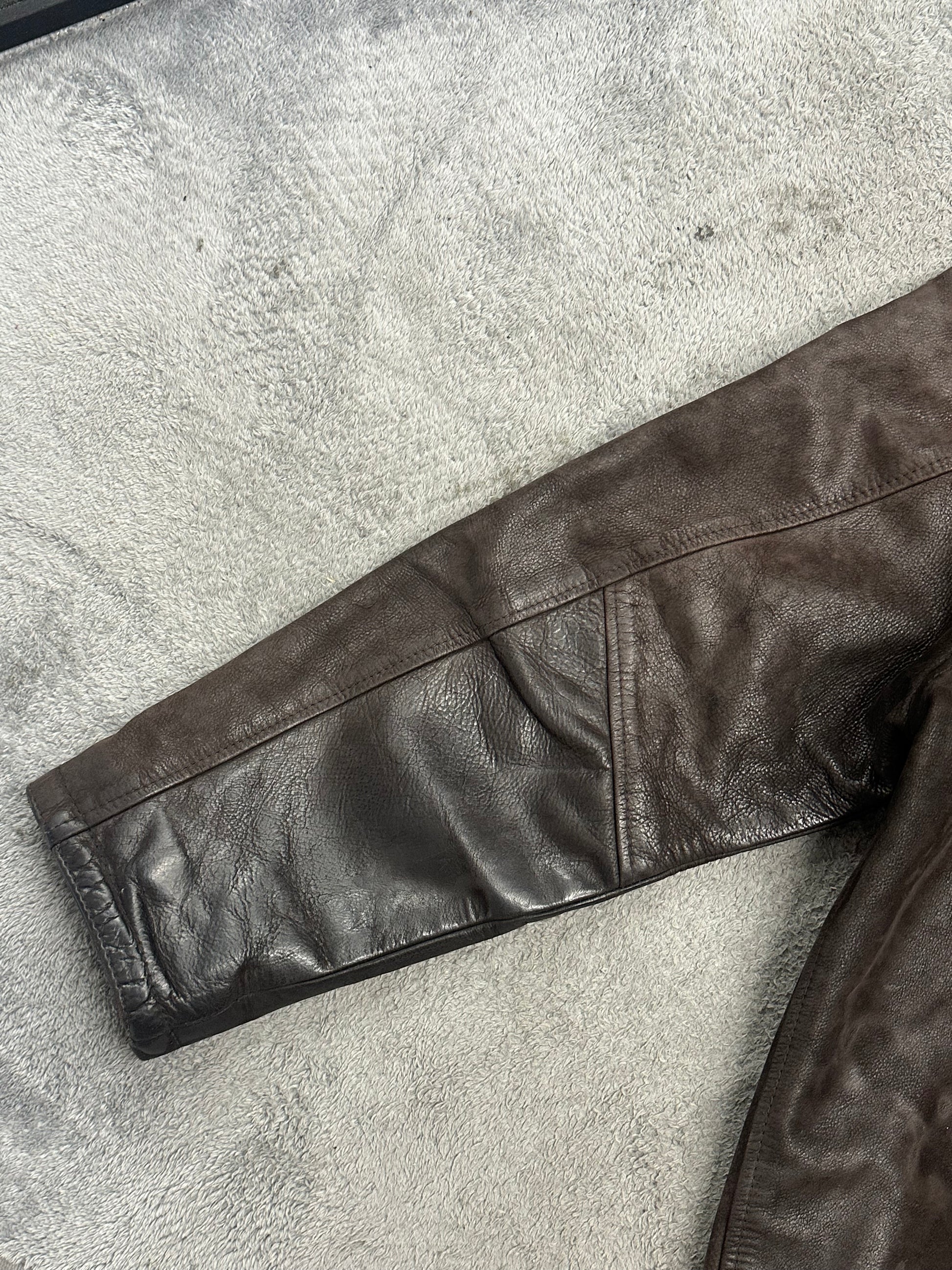 베지터블 가죽의 유니크한 질감과 쓸수록 자연스럽게 빈티지해진 컬러와 주름이 매력적입니다. 소매 시보리가 없이 가죽 단면으로 처리된 모습, 내피 존재 하였으나 유실된 개채입니다.
