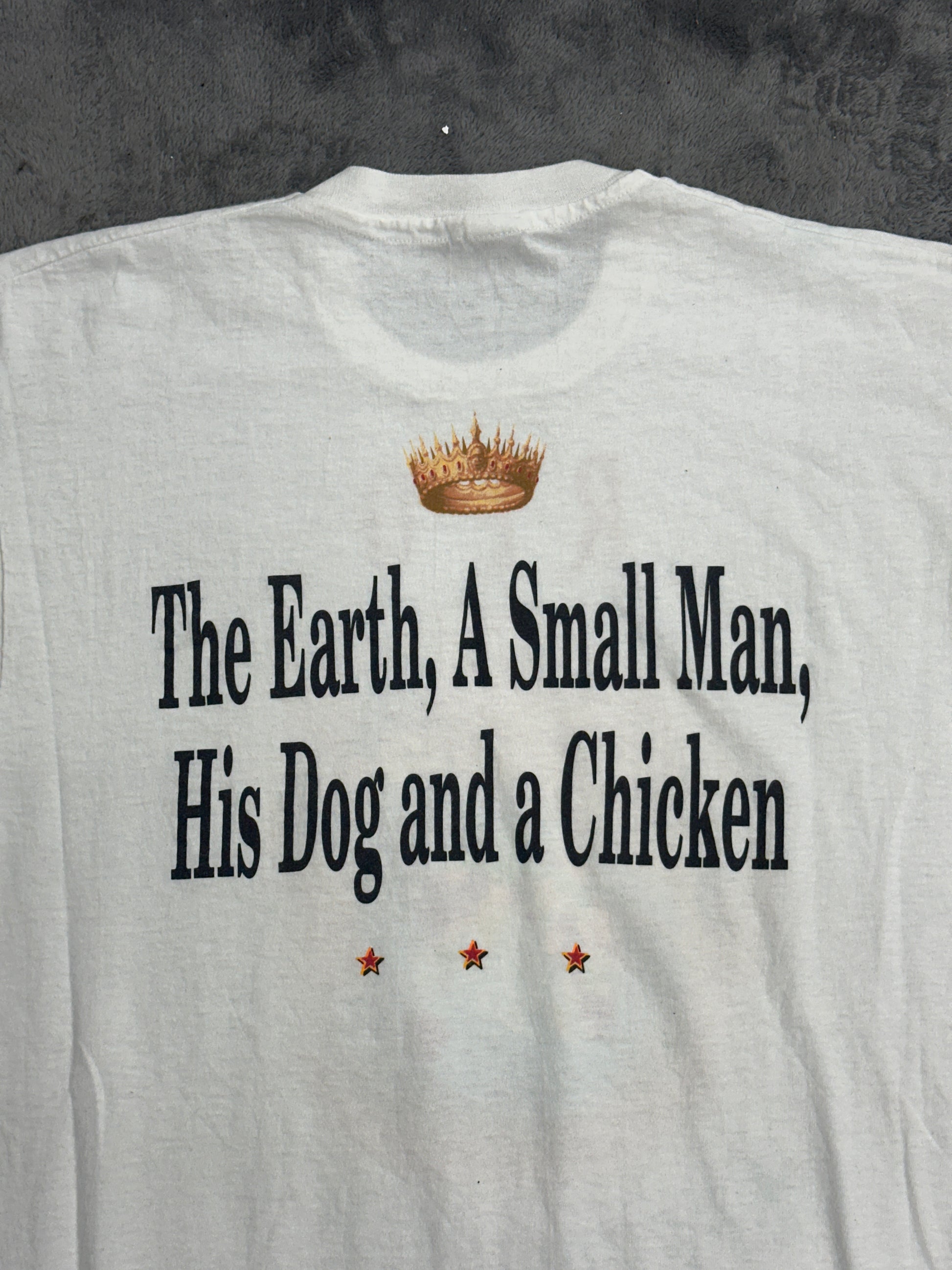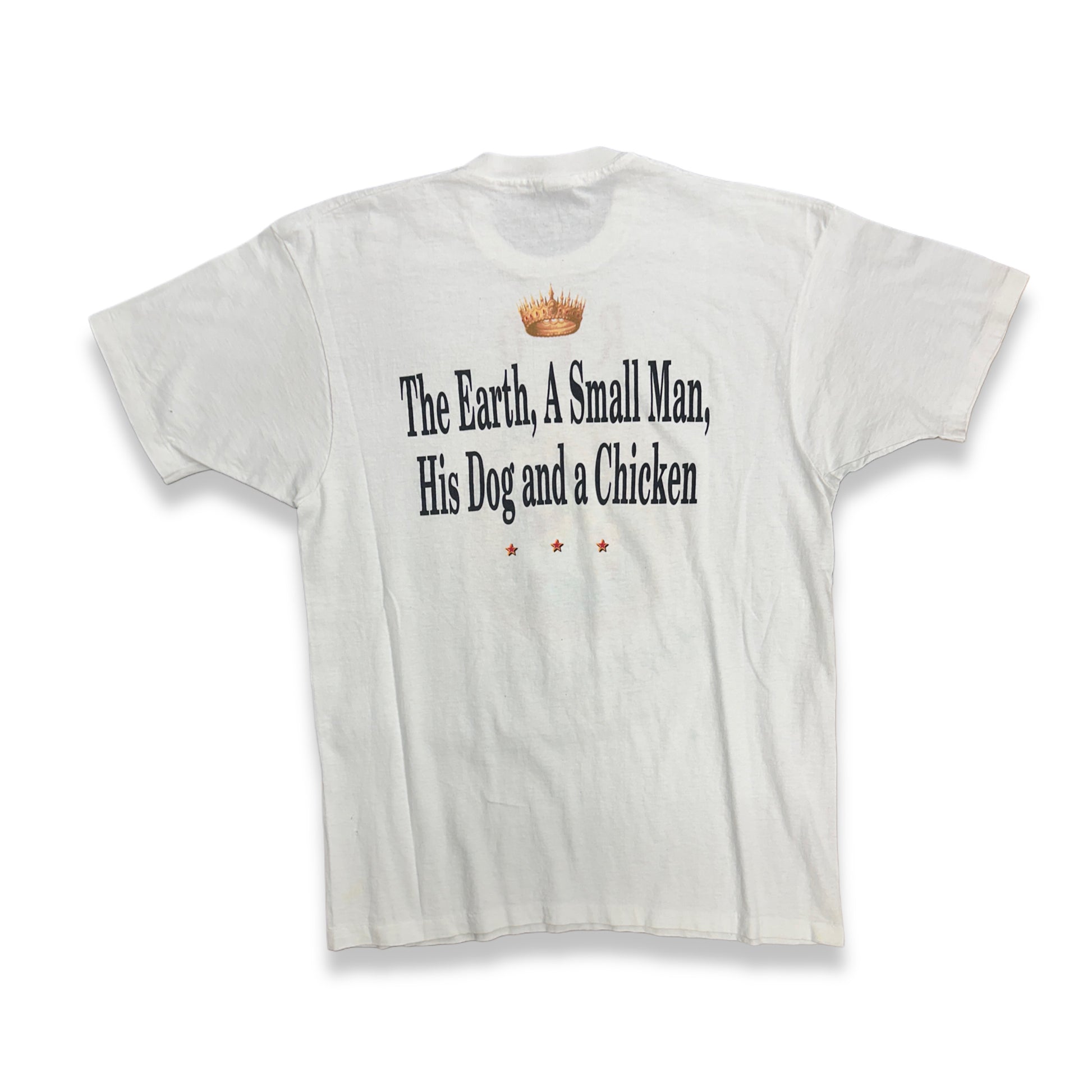REO SPEEDWAGON의 The Earth, a Small Man, His Dog and a Chicken (1990) 앨범 커버 아트워크 티셔츠입니다.