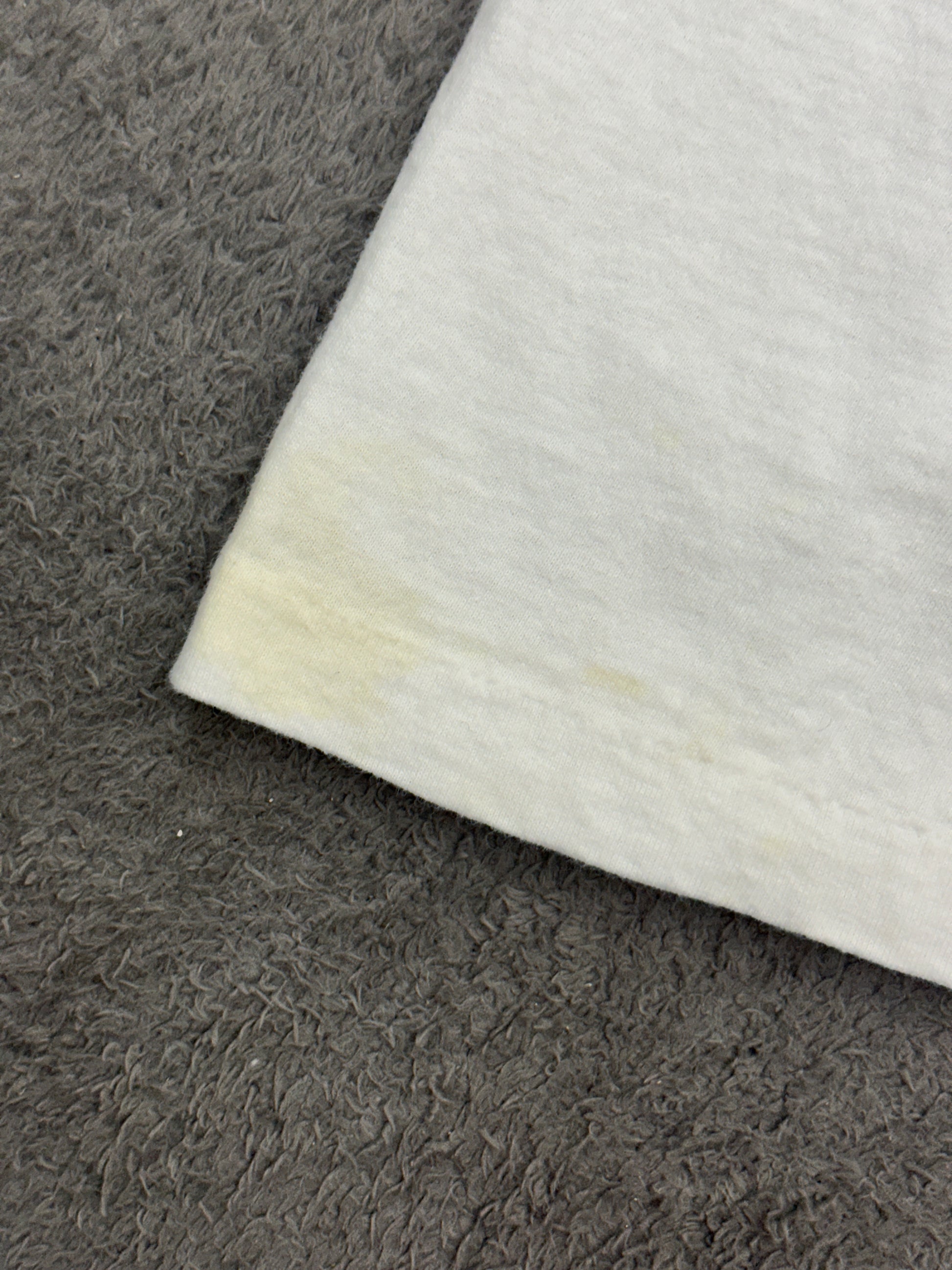 싱글 스티치, 튜블러 제작 방식의 빈티지 티셔츠 개체입니다. 핀홀, 부분 오염 존재 외 전체적으로 좋은 컨디션입니다.