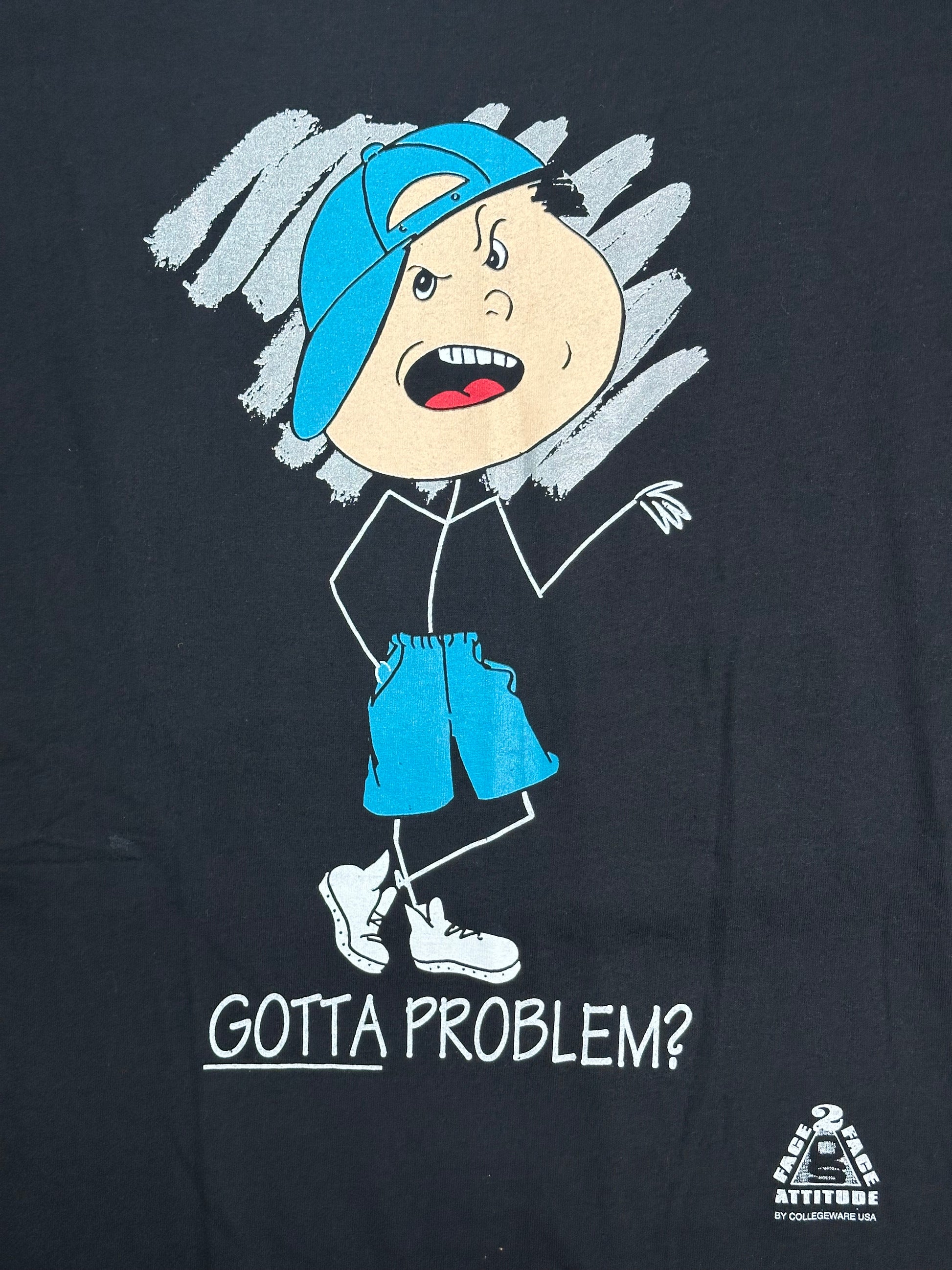 90년대 제작 개체 Gotta Problem? 카툰 티셔츠입니다. 싱글 스티치, 튜블러 제작 방식의 빈티지 티셔츠 개체입니다. 전체적으로 좋은 컨디션입니다.
